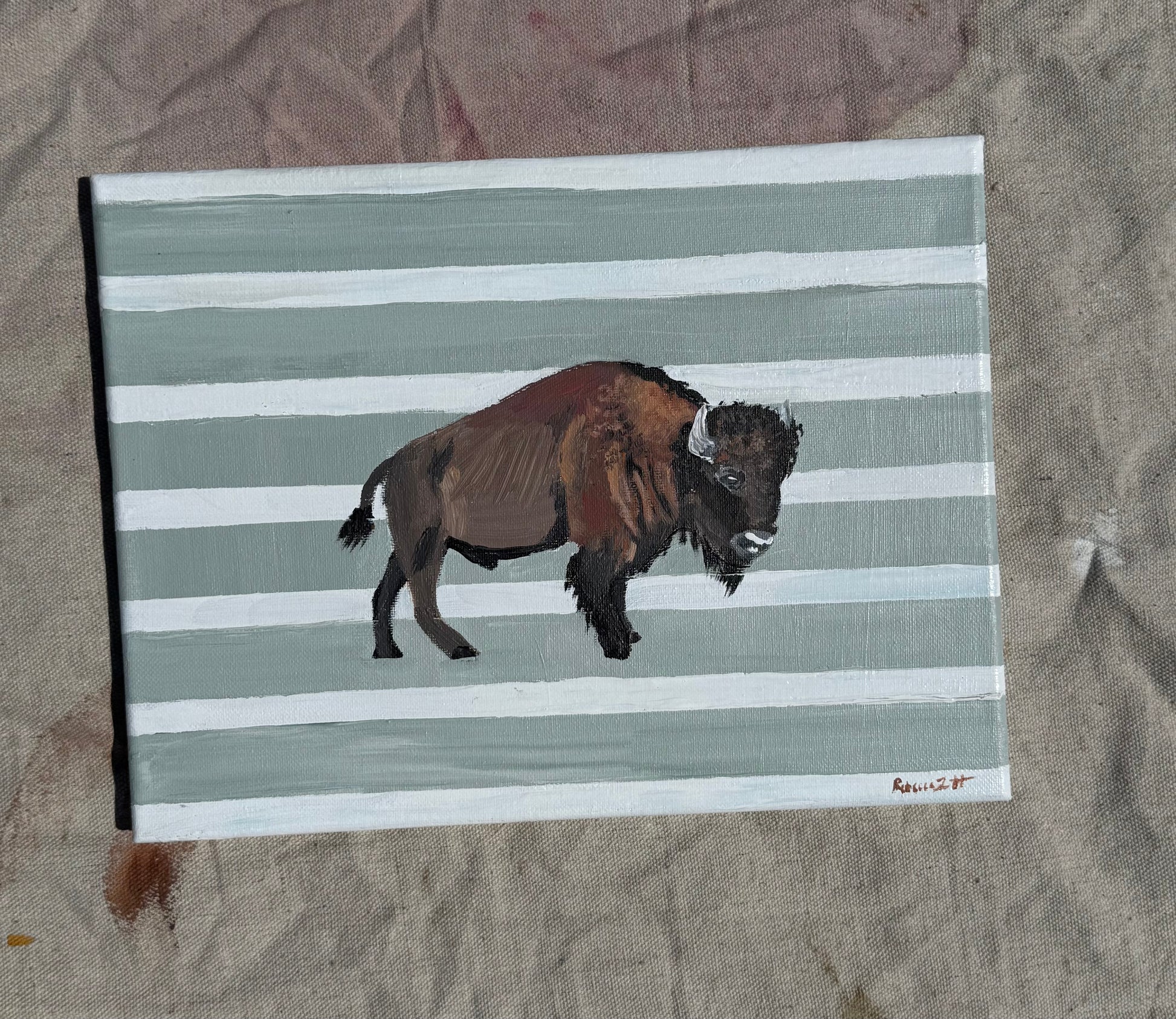 The bison, a symbol of strength and endurance, stands against structured stripes. Representing the balance of power and order in the natural world.